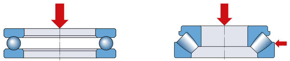 推力轴承主要承受沿轴线方向的载荷。根据其不同的设计,推力轴承可承受单向或双向的纯轴向载荷,而某些轴承可额外承受径向载荷(联合载荷)。推力轴承不能达到与同尺寸径向轴承一样高的转速。